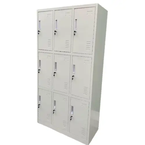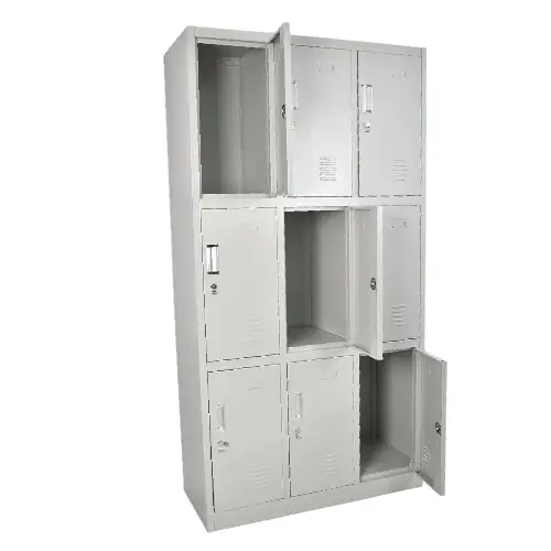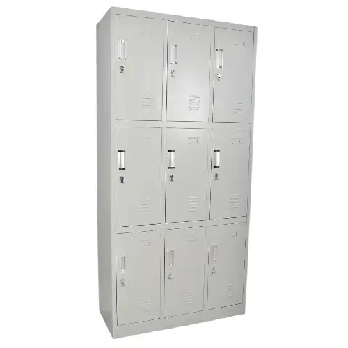 Locker metálico de 9 compartimientos individuales, ideal para oficinas, gimnasios, escuelas o fábricas. Fabricado en acero laminado de alta resistencia con acabado en pintura electrostática color gris claro, que garantiza durabilidad y resistencia a la corrosión. Cada puerta cuenta con cerradura individual, ranura para ventilación y porta etiquetas para identificación. Su diseño compacto permite una organización eficiente en espacios reducidos.