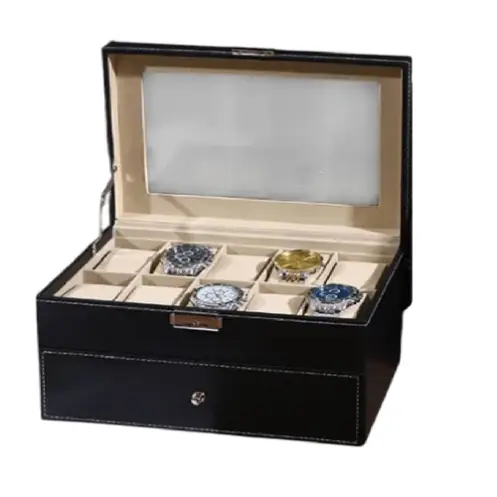 Nivel superior con tapa transparente y compartimentos individuales para relojes.