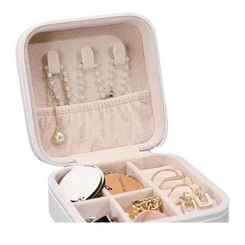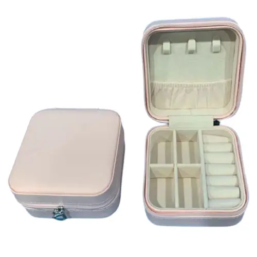 Práctico y elegante estuche de viaje para joyas en color rosa claro, con interior aterciopelado y múltiples compartimentos para anillos, aretes, collares y pulseras. Su diseño compacto con cierre de cremallera protege tus accesorios mientras los mantiene organizados. Ideal para llevar en la maleta o mantener tus joyas seguras en casa con estilo.
