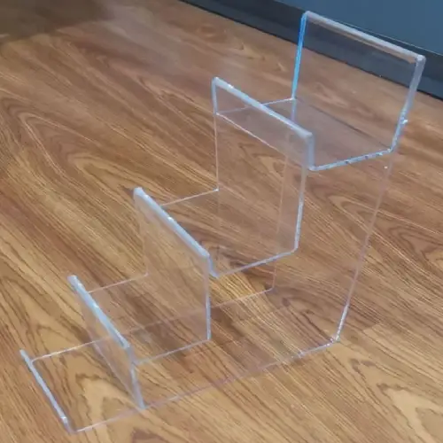 Moderno exhibidor de acrílico transparente con diseño escalonado de tres niveles, ideal para mostrar productos como joyas, cosméticos, relojes o pequeños accesorios. Su estructura clara permite una visualización limpia y elegante, destacando cada artículo sin distraer la atención. Perfecto para vitrinas, ferias, tiendas o decoración de tocadores. Durable, ligero y fácil de limpiar.