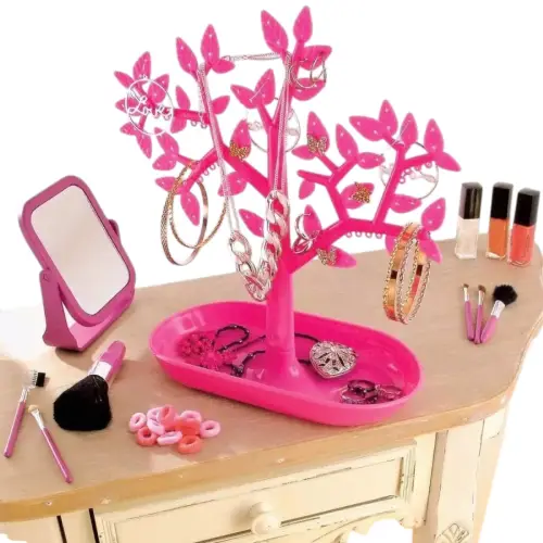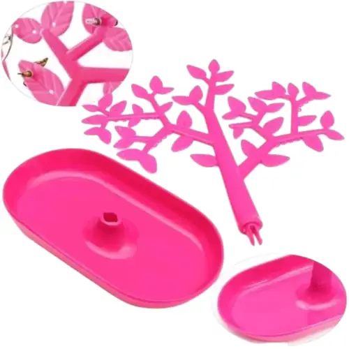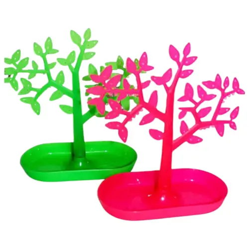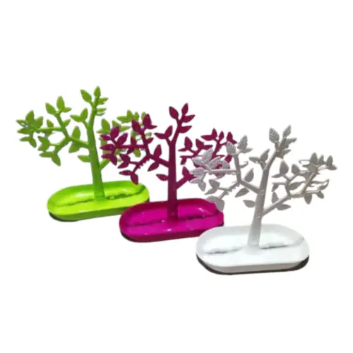 Original organizador de joyas con forma de árbol disponible en colores vibrantes como rosa y verde. Ideal para colgar aretes, anillos, collares o pulseras, manteniendo tus accesorios ordenados y siempre a la vista. Su base ovalada sirve como bandeja para piezas pequeñas. Fabricado en plástico resistente y ligero, perfecto para decorar tu tocador o utilizar en exhibiciones de joyería.
