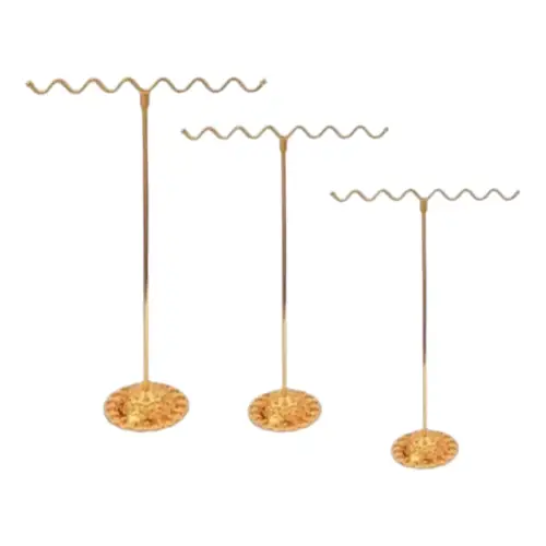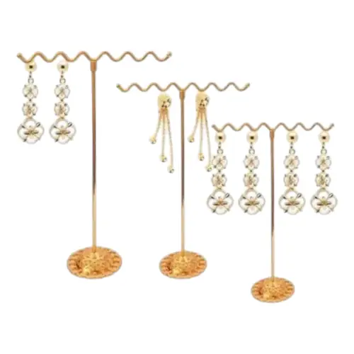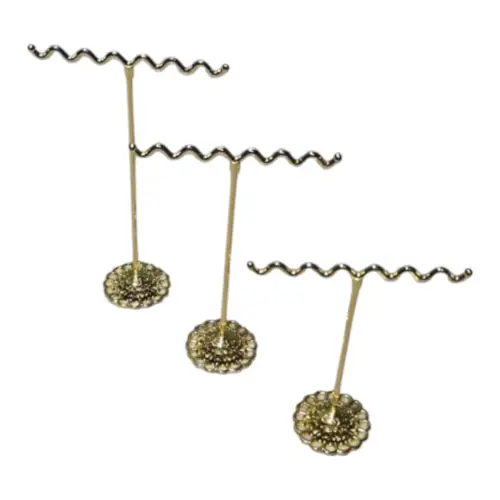 Elegante set de 3 soportes metálicos dorados ideales para exhibir aretes, pulseras o collares. Cada pieza cuenta con una base decorativa en forma de flor y una barra superior ondulada que añade un toque moderno y sofisticado. Perfectos para uso en vitrinas, ferias o tocadores personales. Su diseño estable y brillante realza la presentación de tus accesorios favoritos.