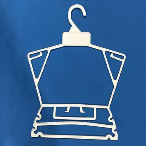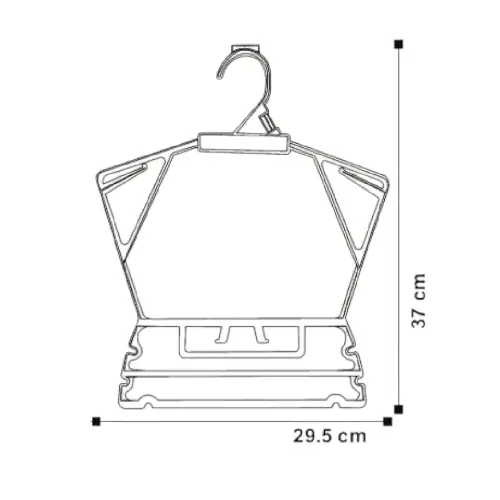 Colgador resistente de plástico, diseñado especialmente para exhibir y organizar jeans, pantalones o prendas pesadas. Cuenta con gancho superior giratorio y estructura amplia que brinda soporte seguro. Sus medidas son 37 cm de alto por 29.5 cm de ancho, ideal para uso en tiendas de ropa o en el hogar.