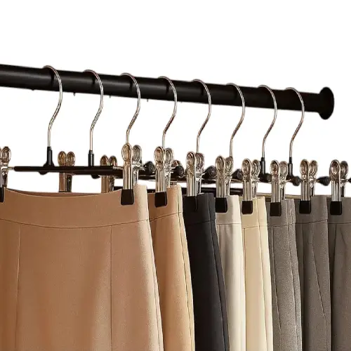 Práctico pack de 5 colgadores metálicos con pinzas ajustables, ideal para organizar faldas, pantalones, shorts y prendas delicadas. Fabricados en acero resistente con ganchos giratorios, ofrecen firmeza y durabilidad. Sus pinzas con protectores evitan daños en la tela y aseguran una sujeción antideslizante. Medidas aproximadas: 30 x 10.5 cm. Perfectos para mantener el clóset ordenado y aprovechar mejor el espacio.