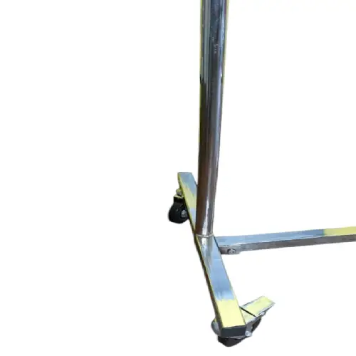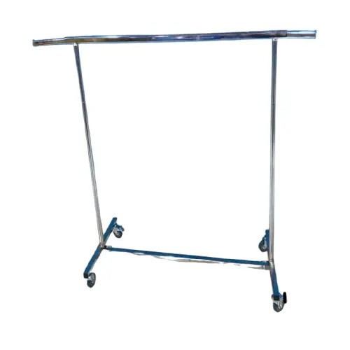 Exhibidor metálico de una barra, fabricado en tubo cromado de alta resistencia. Incluye ruedas giratorias que facilitan su desplazamiento y uso en diferentes espacios. Ideal para colgar ropa, abrigos o accesorios en tiendas, ferias o el hogar. Su diseño práctico, ligero y brillante ofrece una presentación limpia y profesional para cualquier tipo de prenda.