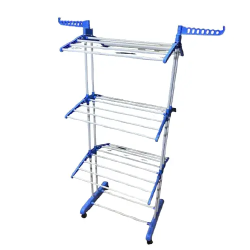Tendedero multifuncional de tres niveles ideal para secar y organizar la ropa de manera práctica y eficiente. Fabricado con tubos metálicos y conectores de plástico resistente, combina durabilidad con ligereza. Su diseño vertical optimiza el espacio y las ruedas giratorias permiten moverlo fácilmente. Incluye brazos laterales abatibles para colgar prendas adicionales como camisas, toallas o ropa delicada.
