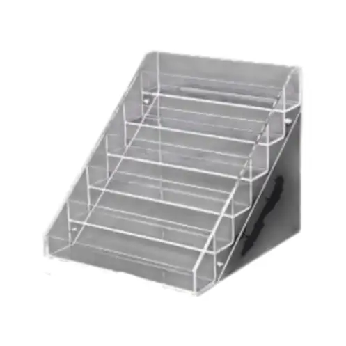 Exhibidor inclinado fabricado en acrílico transparente de alta calidad, ideal para organizar y mostrar esmaltes, frascos pequeños o cosméticos. Su diseño de varios niveles permite una visualización clara de los productos, optimizando el espacio y aportando un aspecto limpio y profesional. Perfecto para salones de belleza, tiendas o uso personal.