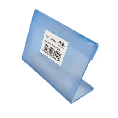 Soporte porta preció fabricado en acrílico transparente, ideal para exhibir precios, etiquetas o información de productos en vitrinas, mostradores y estanterías. Su estructura inclinada facilita la lectura y brinda una presentación limpia y profesional. Resistente, ligero y fácil de limpiar.