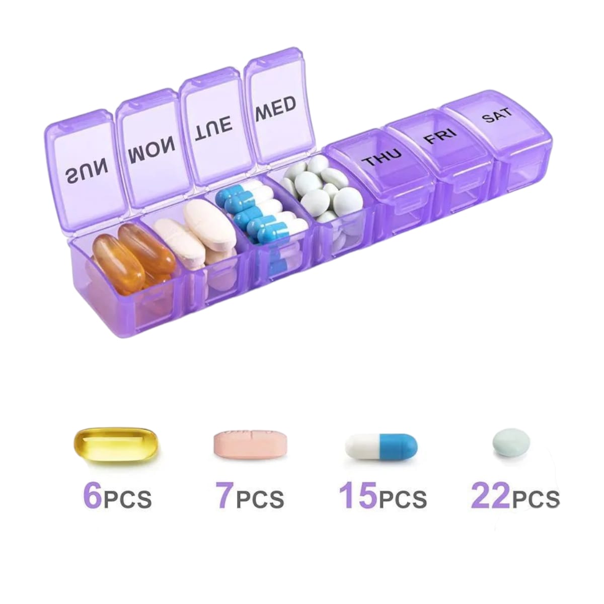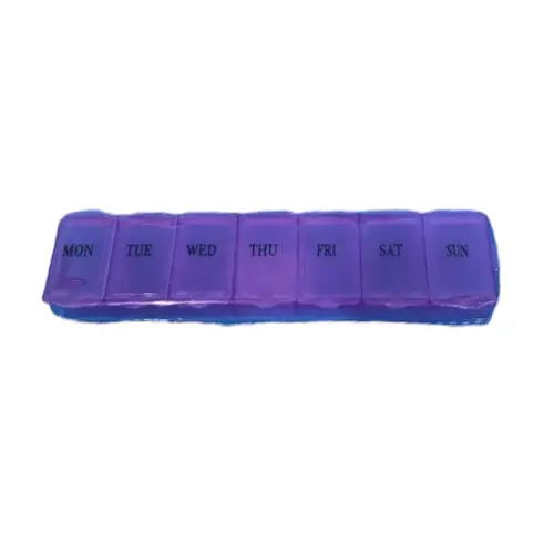 Organizador de pastillas con 7 compartimentos individuales, uno para cada día de la semana (lunes a domingo). Fabricado en plástico resistente de color morado translúcido, permite ver fácilmente el contenido de cada compartimento. Ideal para llevar un control diario de medicamentos, vitaminas o suplementos. Compacto, ligero y práctico para el hogar o viajes.