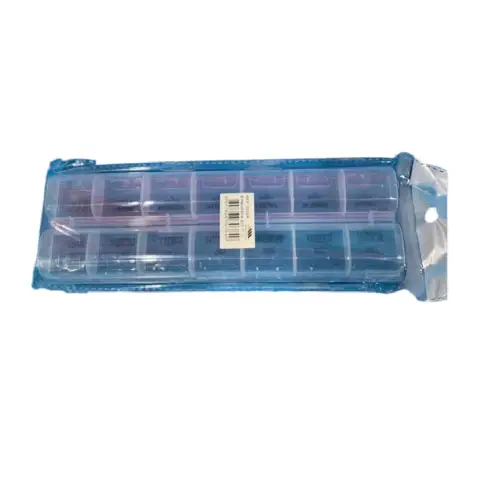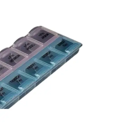 Organizador de pastillas con compartimentos diarios para dos tomas al día (mañana y noche). Fabricado en plástico resistente y con etiquetas de los días de la semana para un control fácil y seguro del medicamento. Incluye un práctico estuche transparente con cierre y orificio para colgar. Ideal para viajes o uso diario.